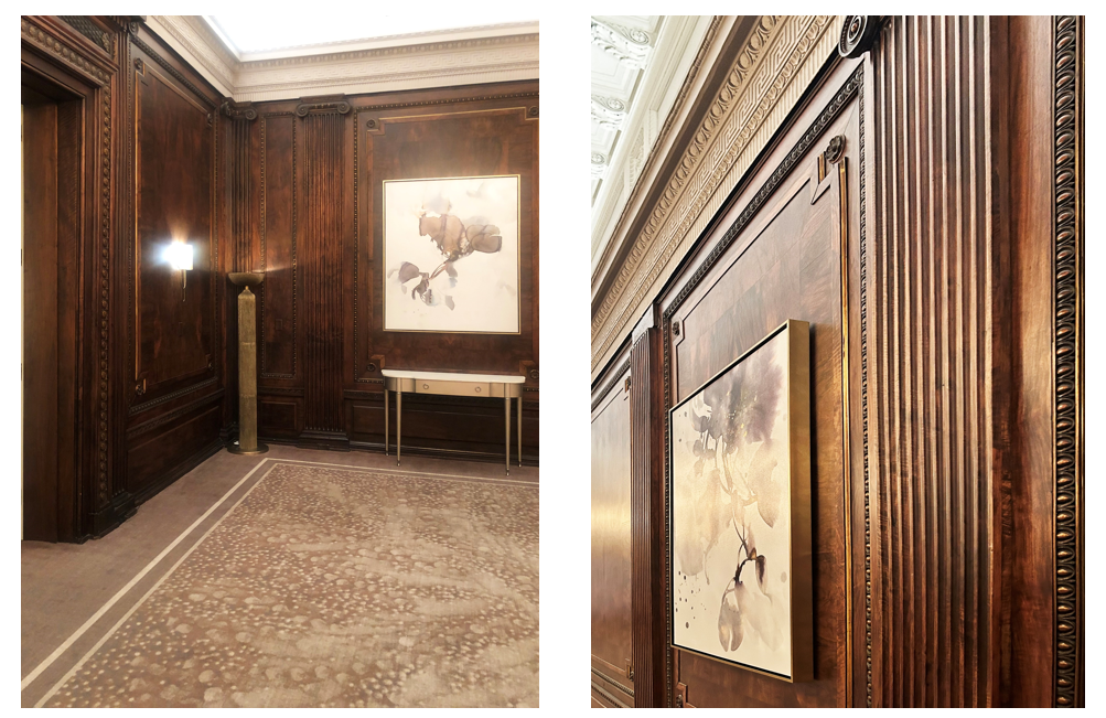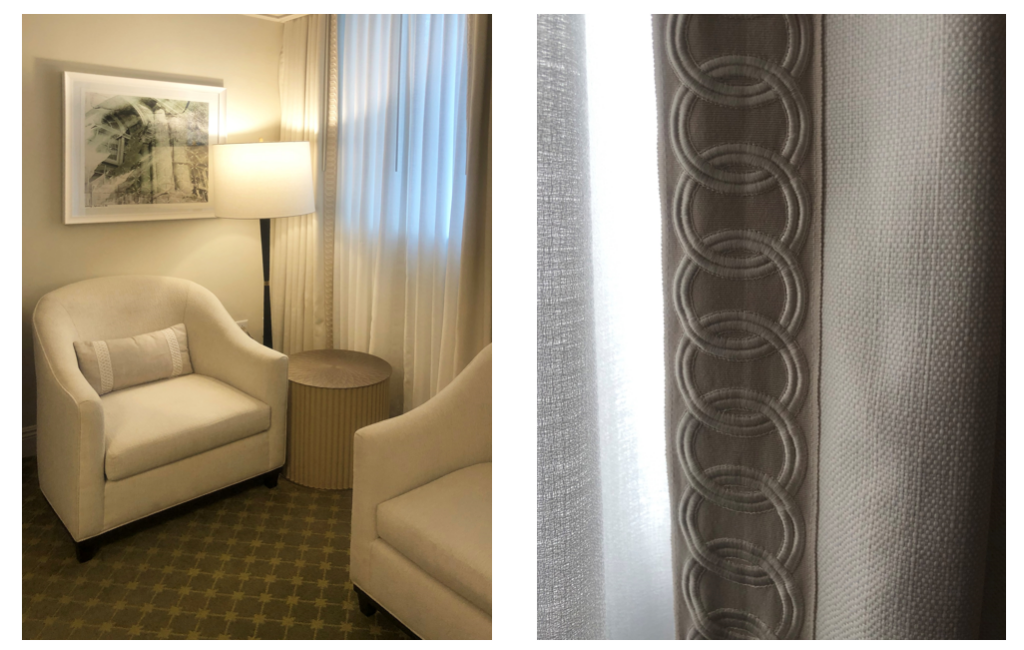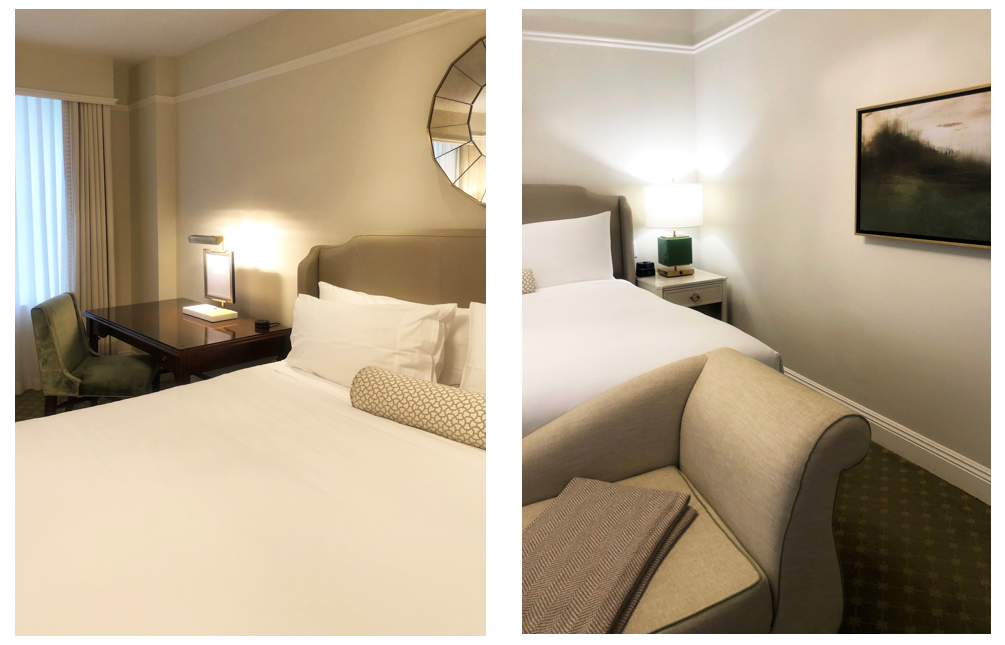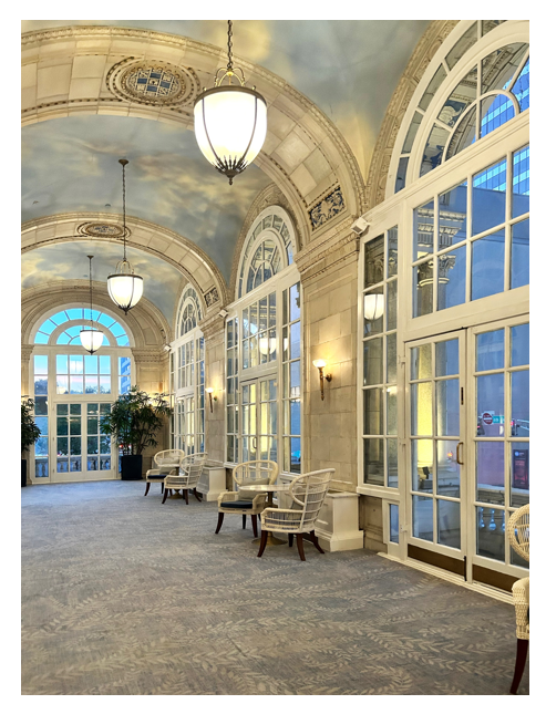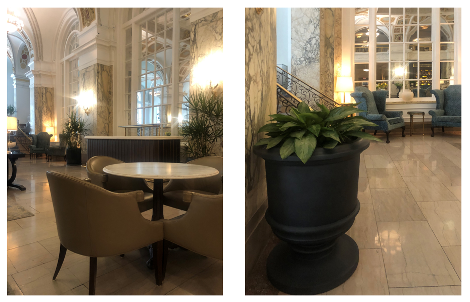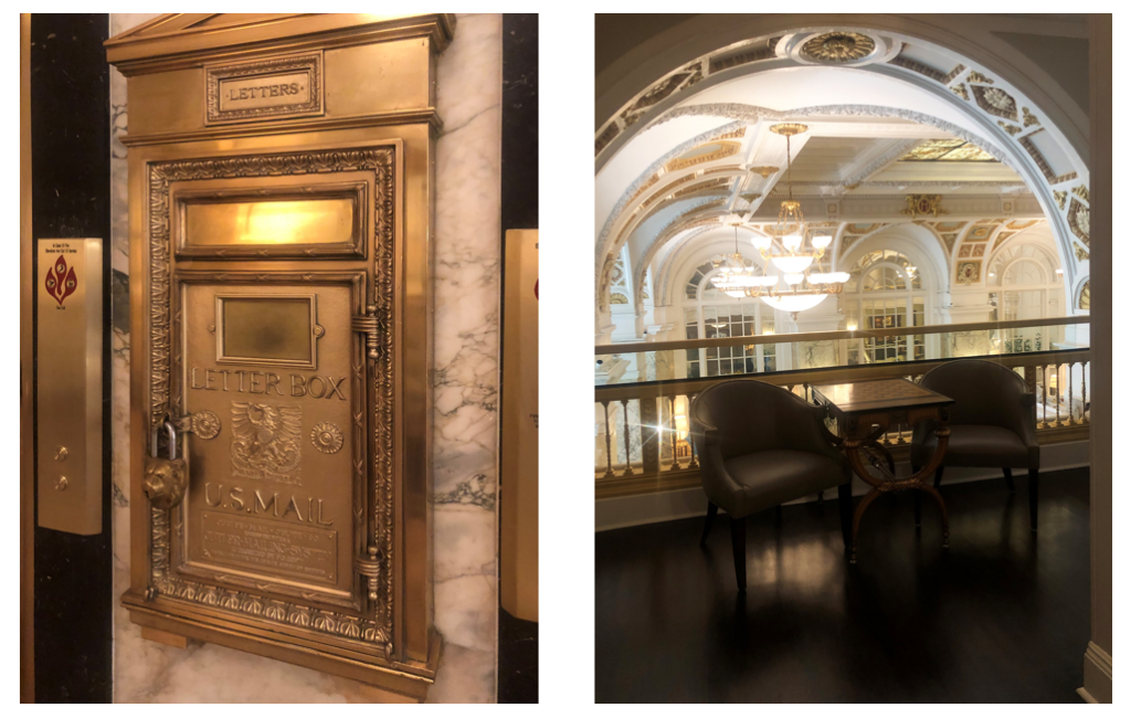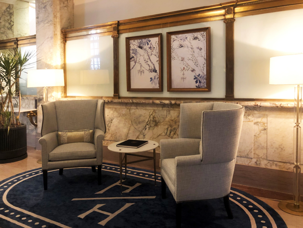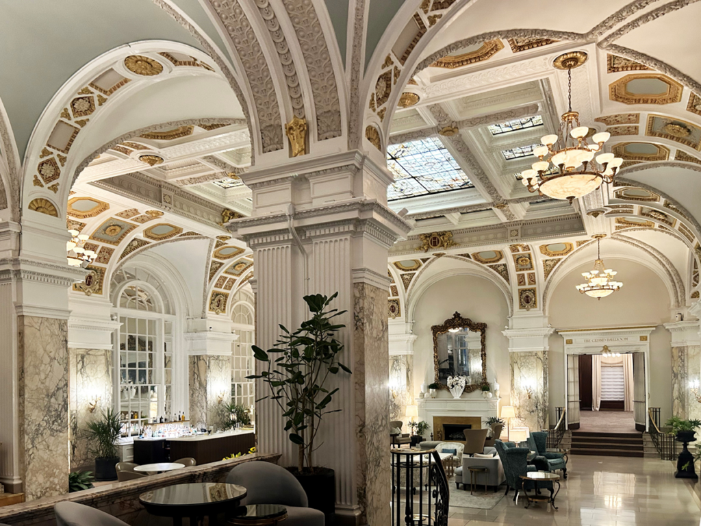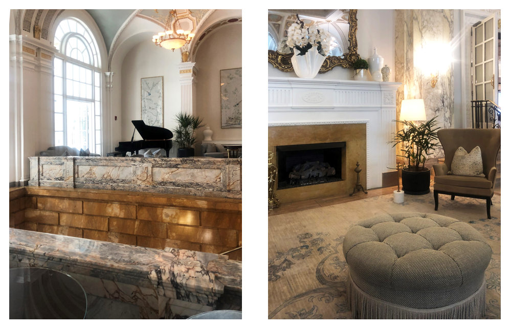 Walking into the grand lobby, there’s no shortage of little details to admire and yet its soft color pallet allows you to take it all in cohesively. The stunning tray ceiling with coffers & stained glass, the arches with gilded geometric patterns and the marble pillars with a nod to the doric order… I absolutely love its classic elements balanced with touches of a more subtle, modern take on lighting and furnishings. We learned that the most recent renovation was masterfully designed by ForrestPerkins and they can now count me as one of their many fans.