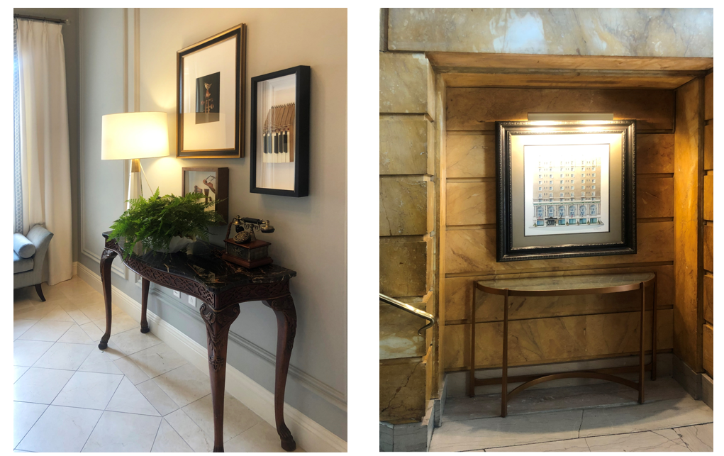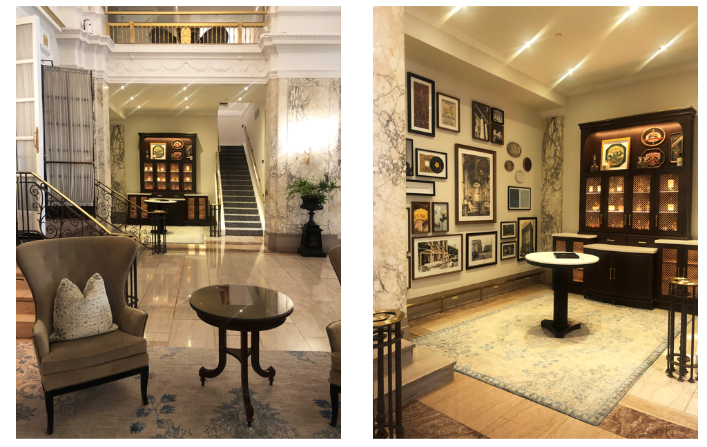 The luxurious walnut panelled walls in the ballroom mimic the doric order from the lobby, but this time in a stain instead of white. Once again, the extravagantly patterned carvings are balanced with smooth panels and more modern furnishings, art & lighting. Just outside its doors, a small space is carved out for displaying collections significant to the hotel and to Tennessee history.